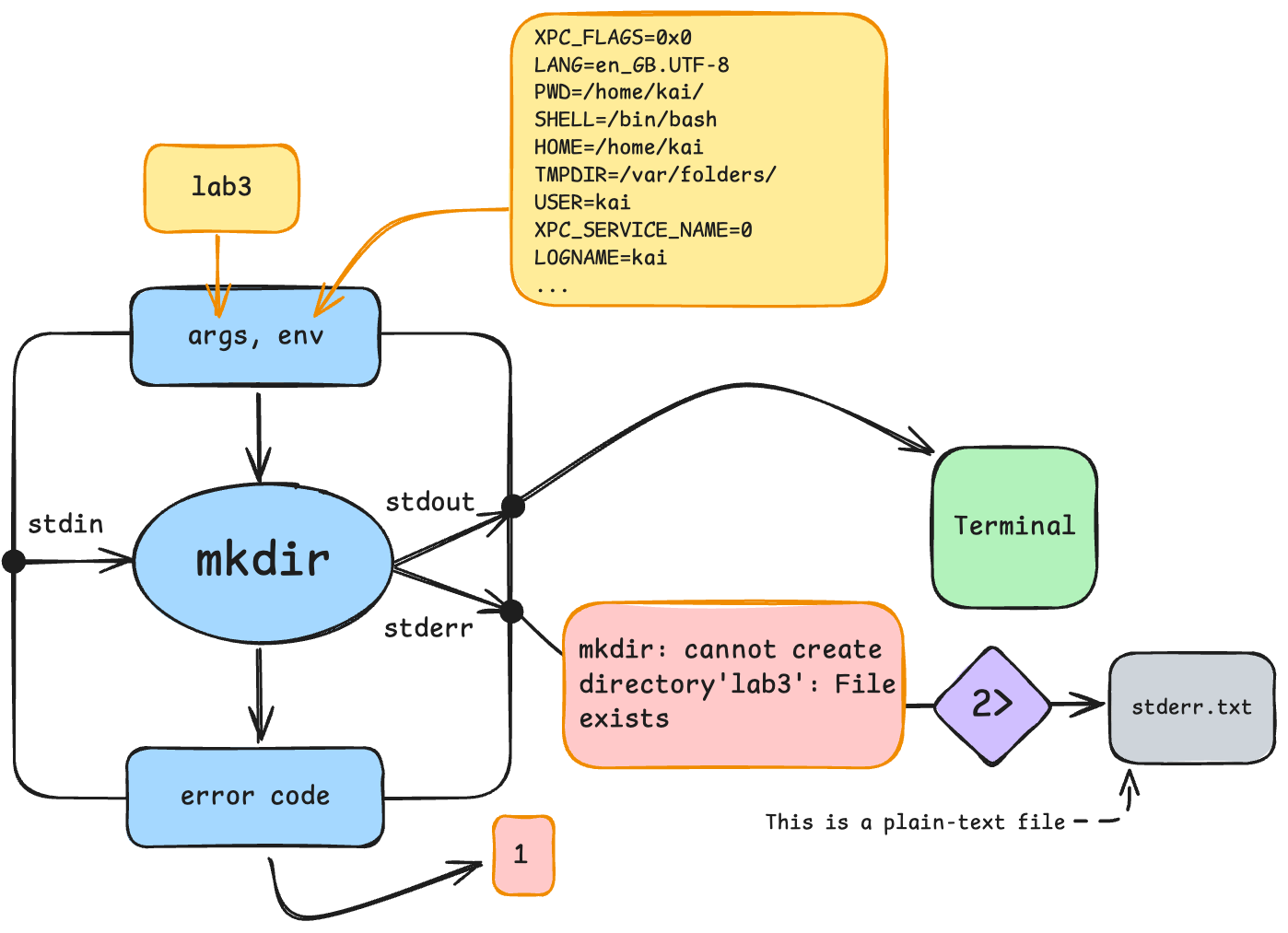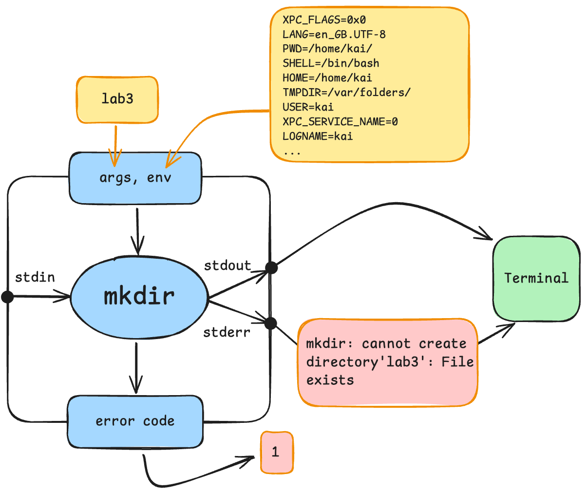 In both lines 5 & 8, we run a command which executes the mkdir programme. This then starts an mkdir process, which encounters an error (lab3 already exists) and terminates with the error code/exit status of 1.